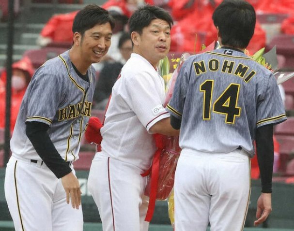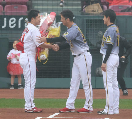 今季限りで現役を引退する広島石原慶幸捕手(41)の引退セレモニーが試合前に行われ、阪神藤川球児投手(40)と能見篤史投手(41)が花束を贈呈した。 pic.twitter.com/LwgcPIcnrw
