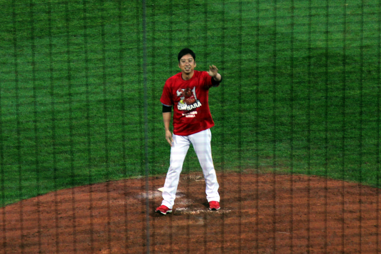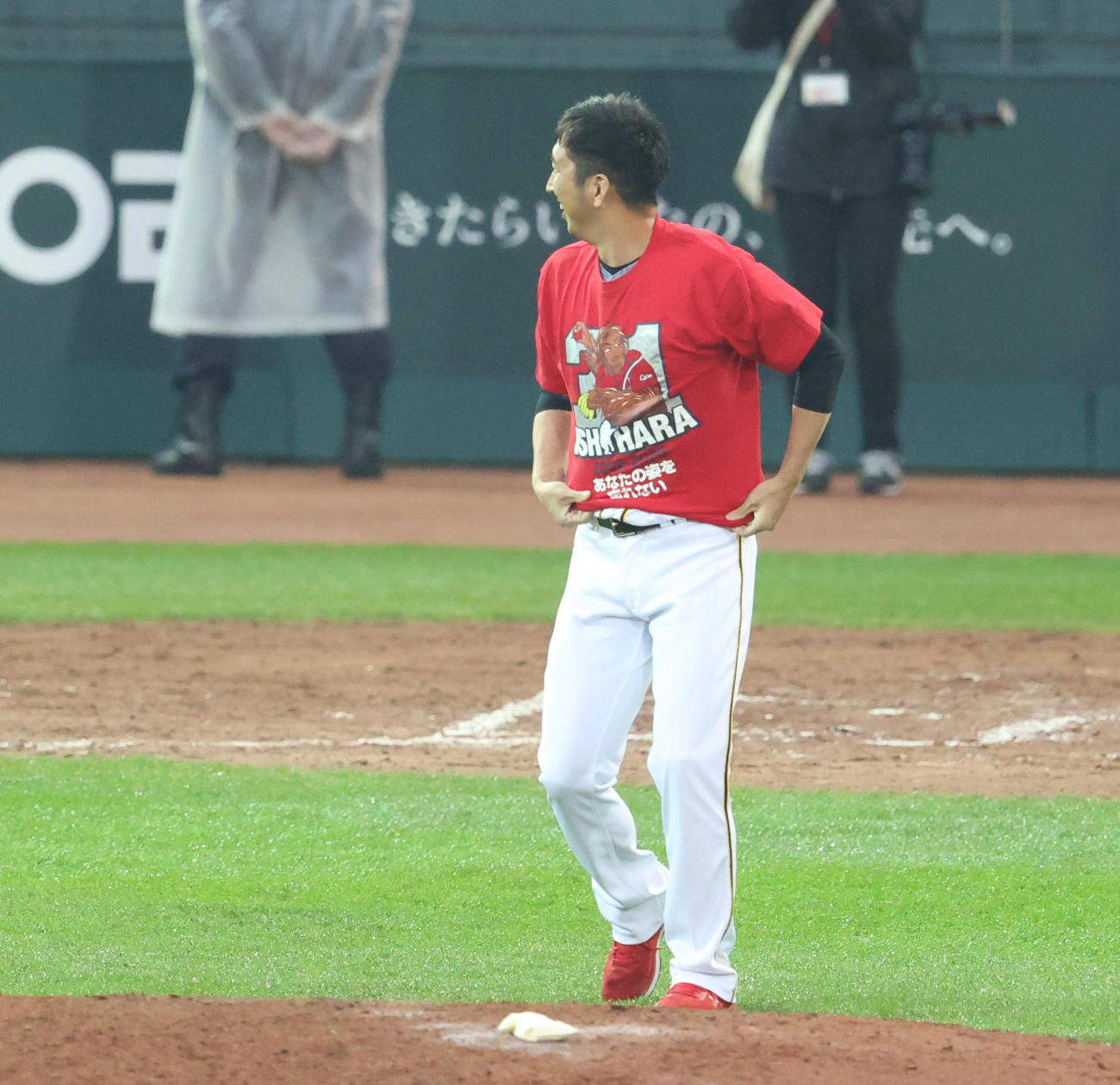 この日の登板機会はなかったが、試合後に自身の登場曲が流れてグラウンドへ。笑顔で手を振り、本塁付近へ近づくと、ポケットから広島石原の引退記念Tシャツを取り出しユニホームの上から着用した。「遠慮させてもらうという形だったんですけど、石原さんと試合前に話して、ぜひ広島でもやってほしいということだったので」と感謝。試合前には能見とともに花束を手渡し、本塁付近で3人で記念撮影した。