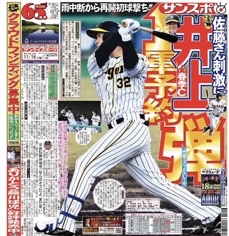 阪神・井上選手がフェニックスリーグでホームランを放ちました。来春の1軍キャンプ行きを志願。ドラ1・佐藤選手が刺激となっています。本日の大阪サンスポに掲載されています。よろしくお願いします。
