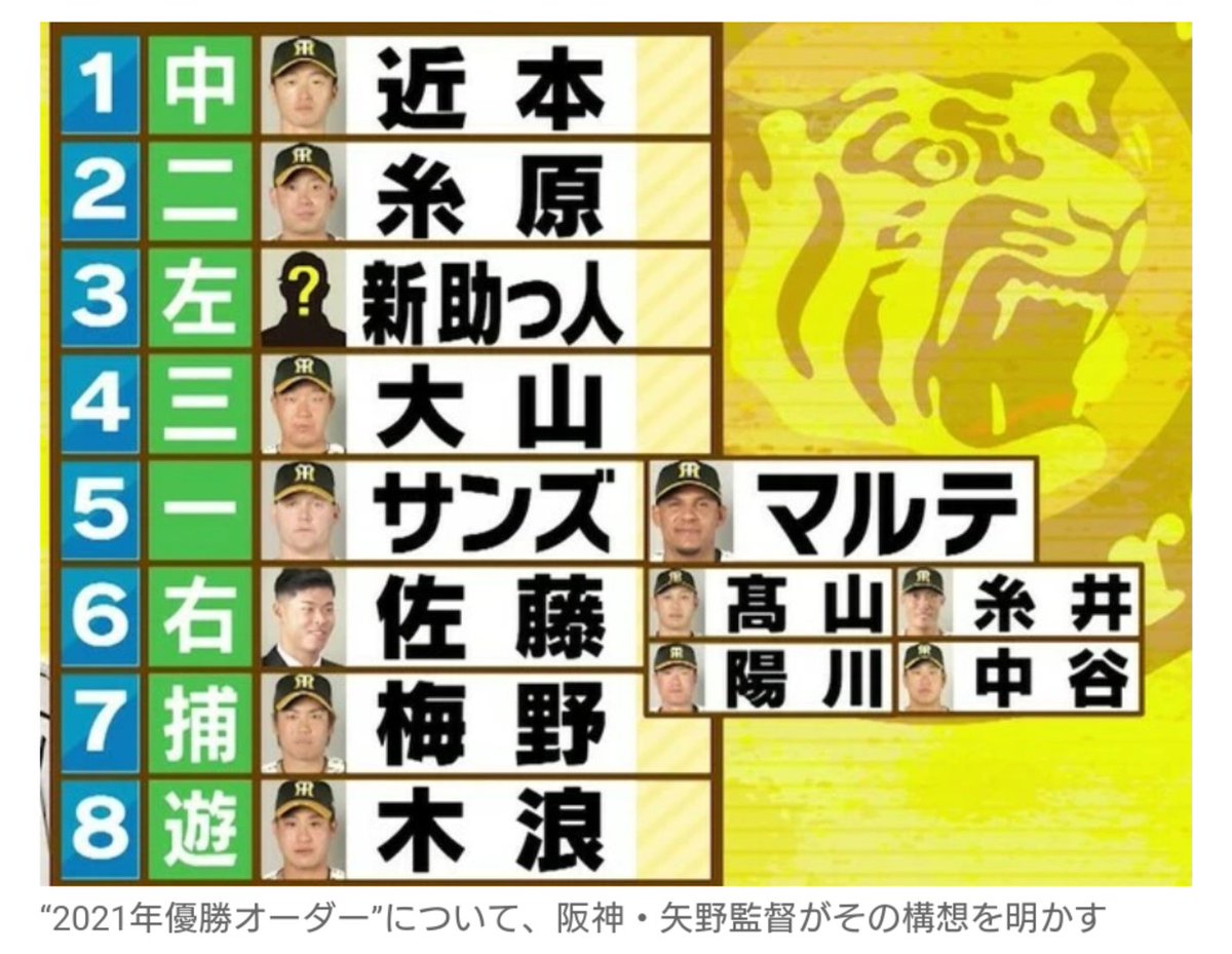 阪神・矢野監督が関西の番組で自ら発表…『2021年優勝オーダー』はこれだ 期待の“新助っ人”は3番に https://headlines.yahoo.co.jp/hl?a=20201212-00010005-kantele-base …