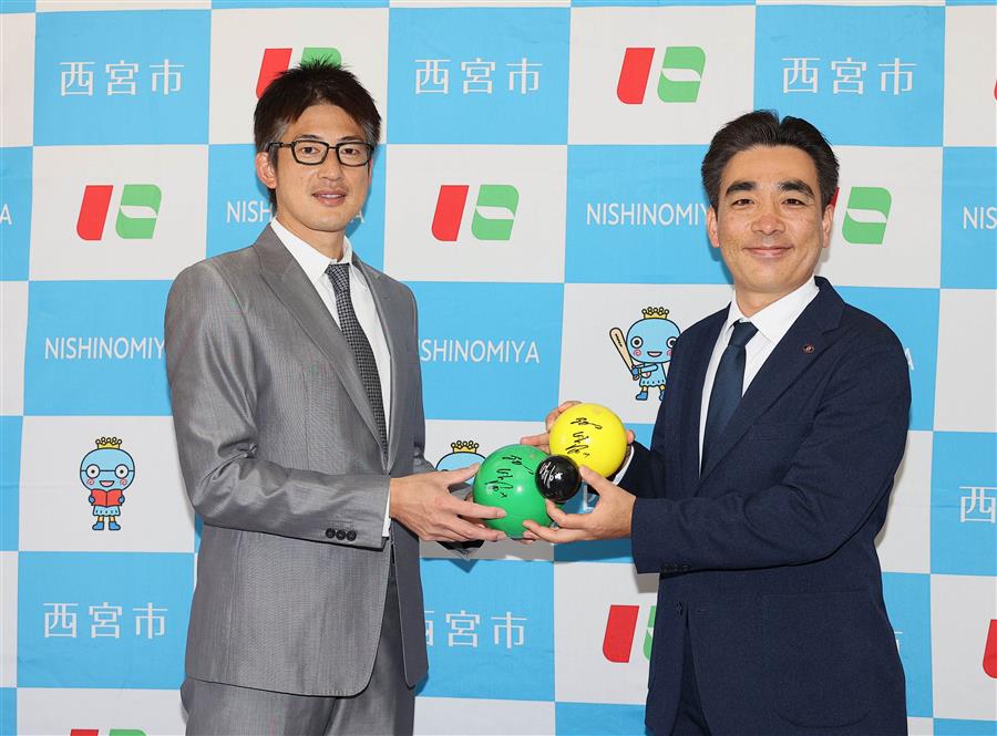 17日(木)、能見篤史選手が西宮市役所を訪問し、子どもたちへの玩具「やわらかボール」の寄贈式を行いました。