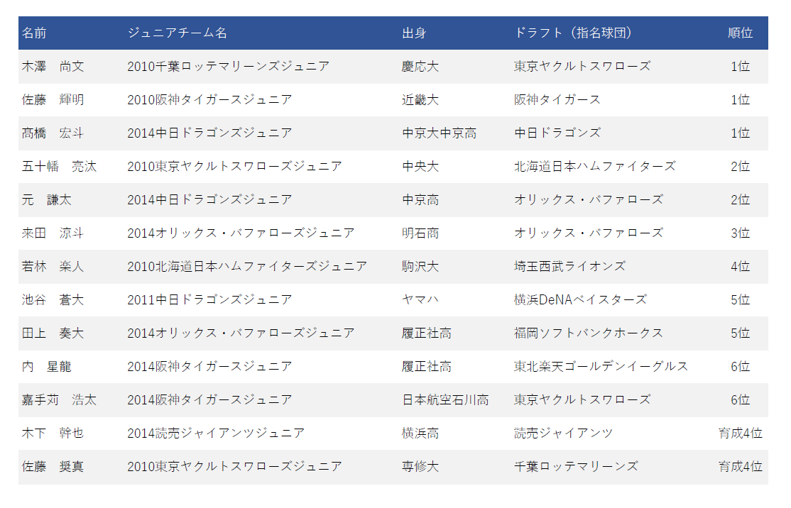 10月26日に行われた今年のプロ野球ドラフト会議では、ジュニアトーナメント大会出場経験のある選手が過去最多13名指名を受けました。13名中3名が、ドラフト1位での入団となりました!これからも皆さんのご活躍を応援しています。