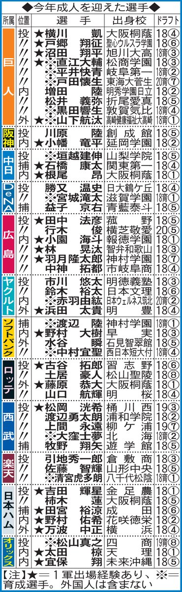 20歳の誓いに1軍デビューを掲げ「ファームでしっかり結果を出して、1軍で呼ばれるシーズンにしたい」。現在はスムーズな投球フォームを目指し、ソフトバンク和田や巨人杉内投手コーチら左腕の動画を見て研究中。体重を3キロ増の90キロにすることも今年の目標だ。同期の小幡は昨季1軍で経験を積んでおり「すごいなと思いつつも、負けられないという気持ちもあるので、負けないようにやっていきたい」と力を込めた。