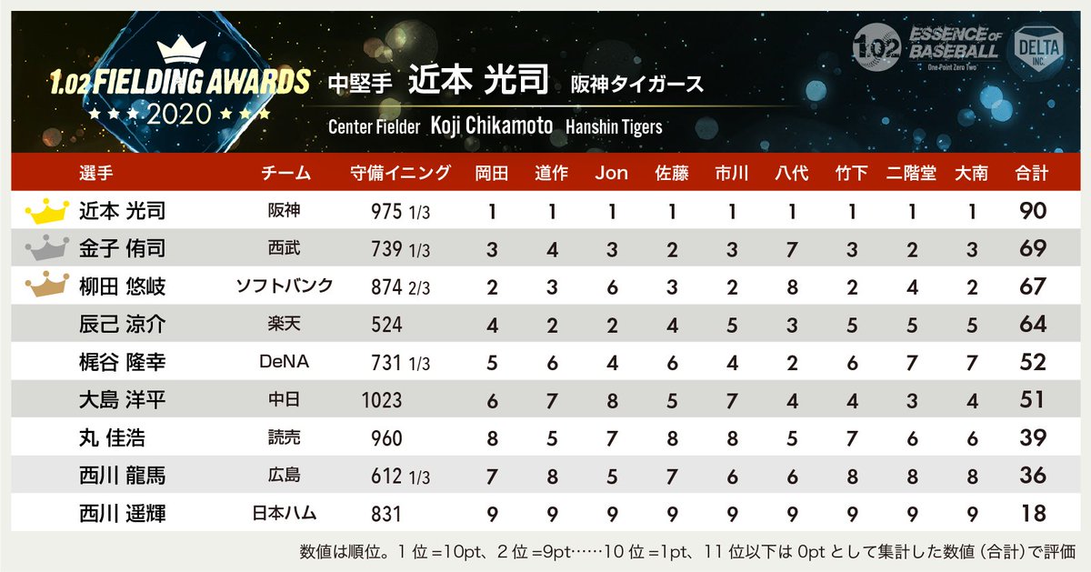 米国には、データアナリストが選手の守備を分析し、その結果から優秀守備者を表彰する「Fielding Bible Awards」という賞が存在する。これに倣い、株式会社DELTAではアナリストの協力のもと、「1.02 FIELDING AWARDS」というNPBの優秀守備者を表彰する企画を開催している。