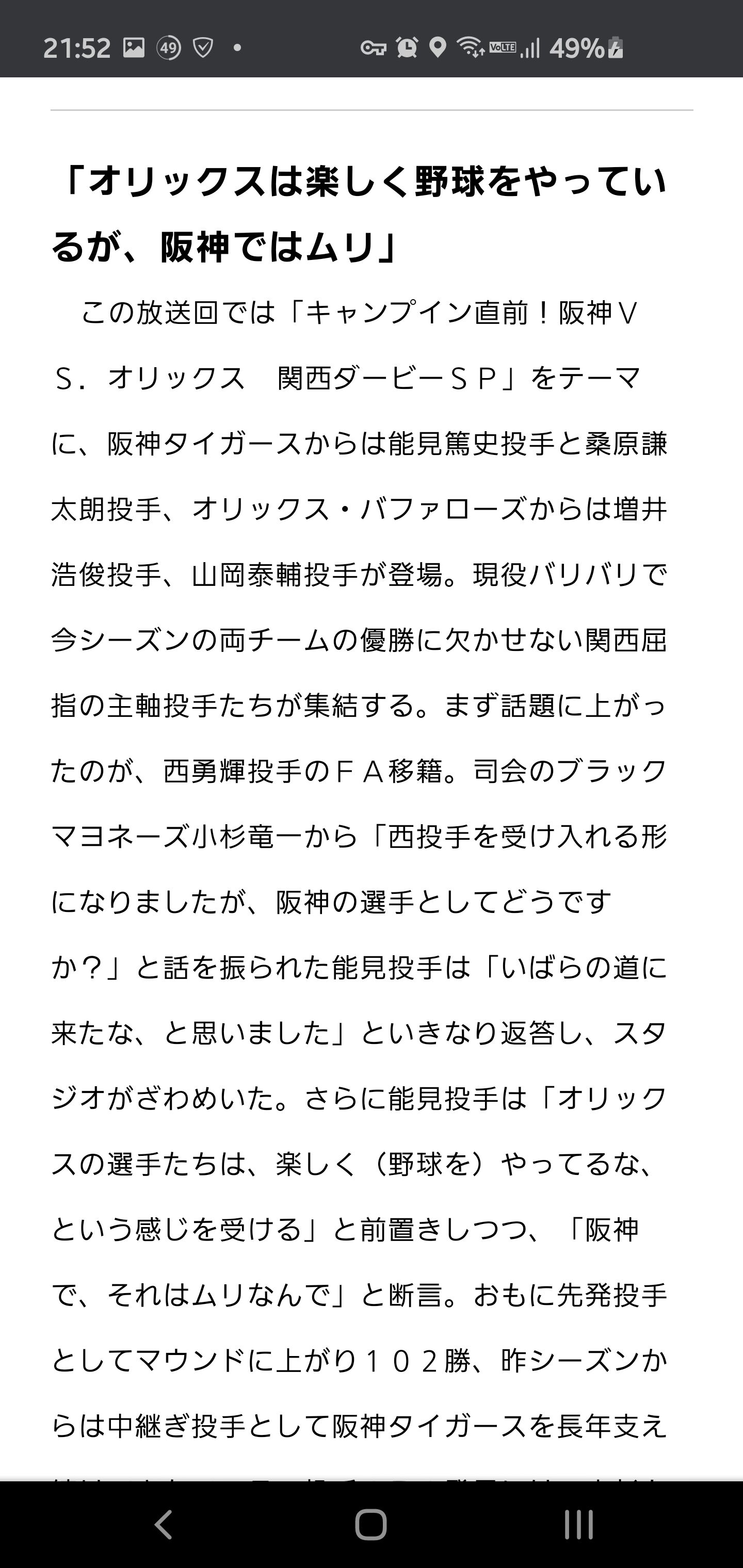 >能見投手は「オリックスの選手たちは楽しく(野球を)やってるな、という感じを受ける。」