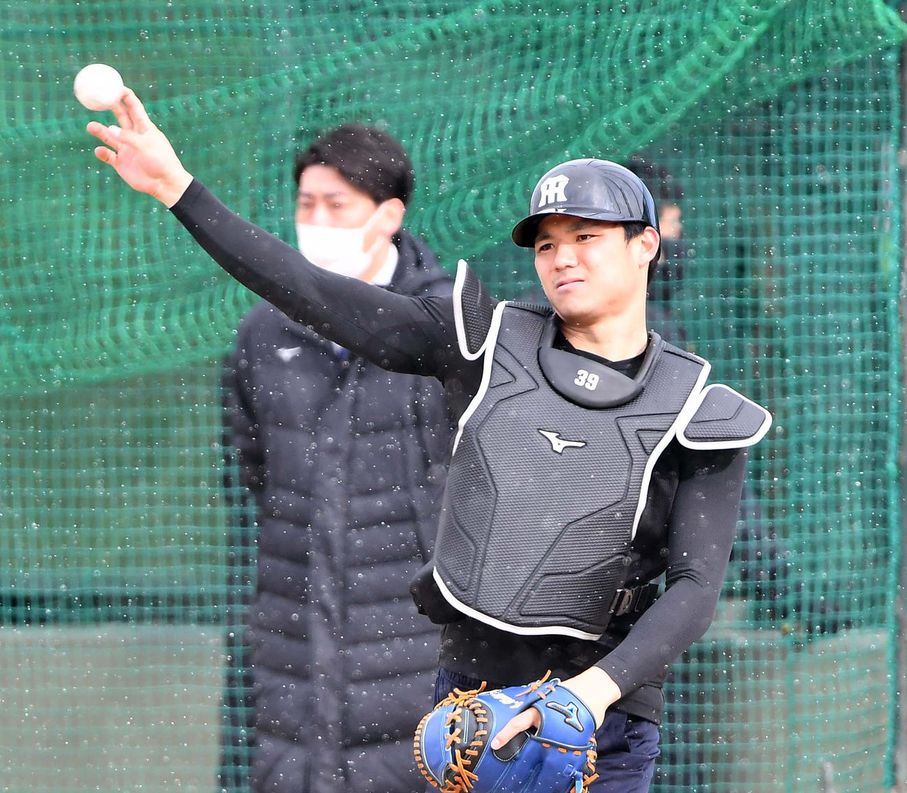 鳴尾浜での新人合同自主トレで、ドラフト3位佐藤蓮の投球を受けた。練習後にはオンラインで取材に応じ、「緊張も多少ありつつ、自分も最初の印象は大事と思って大事に捕りました」と、振り返った。同期右腕については「まだ10割で投げていないと思うが球が重くて、速い。プロに来るだけあるな、という球を投げていました」と球の力を実感した。