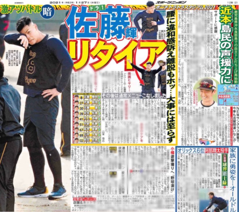 ヒヤリのち笑顔!?阪神ドラ1佐藤輝は腰の違和感訴えるも、大事に至らずメニュー消化― スポニチ Sponichi Annex 野球 https://www.sponichi.co.jp/baseball/news/2021/01/27/kiji/20210127s00001173033000c.html …