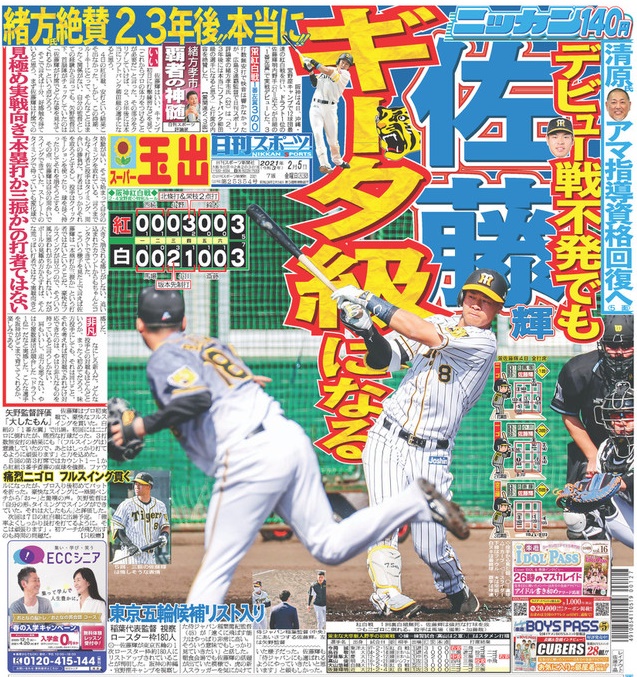 2月5日付大阪最終版1面です。阪神は4日、宜野座キャンプで紅白戦を行い、ドラフト1位佐藤輝明内野手が白組「1番左翼」で実戦デビュー。3打数無安打も本紙評論家の緒方孝市氏は「2、3年後には本当にソフトバンク柳田級の選手になると思う」と打席の内容を絶賛した。#大阪1面 #hanshintigers pic.twitter.com/6BWGLKGWuq