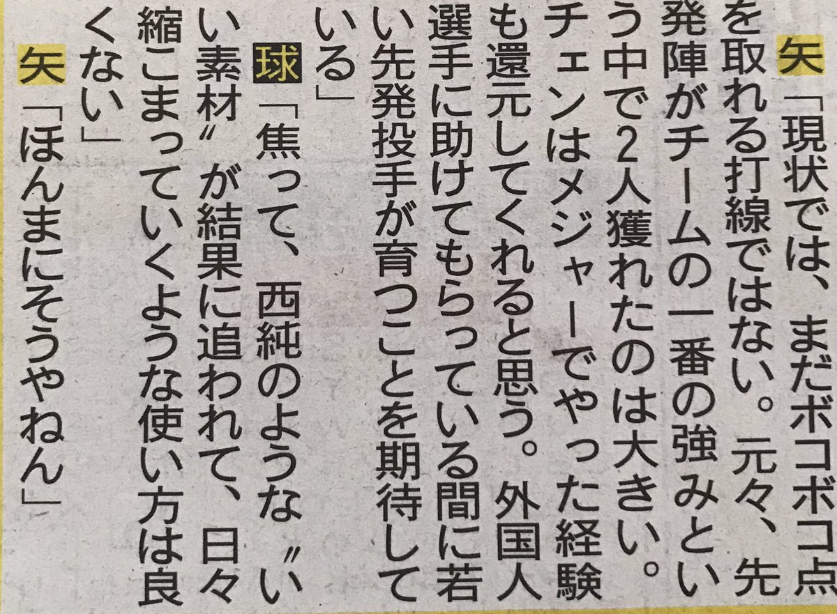 矢「現状では、まだボコボコ点を取れる打線ではない。元々、先発陣がチームの一番の強みという中で2人獲れたのは大きい。チェンはメジャーでやった経験も還元してくれると思う。外国人選手に助けてもらっている間に若い先発投手が育つことを期待している」