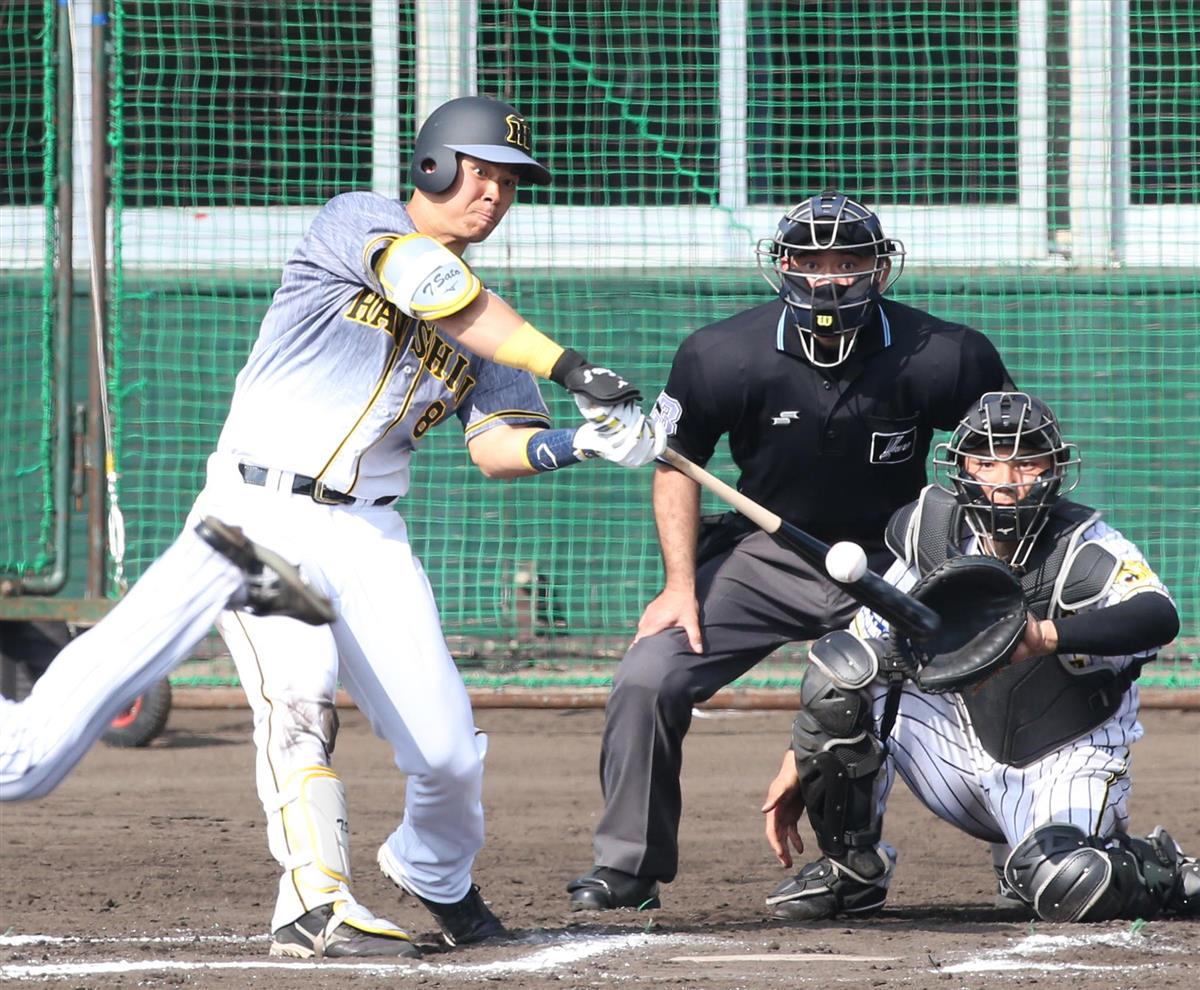 阪神のドラフト1位・佐藤輝明内野手(21)=近大=が7日、紅白戦に紅組の「1番・右翼」で出場。六回に右前打を放ち、プロ6打席目で初安打をマークした。黄金ルーキーは打ち損じだったと猛省したが、フルスイングに巨人・横川史学スコアラー(36)は「うちの岡本より飛ばすんじゃないか」と驚嘆。次こそ会心の一打をかっ飛ばす!