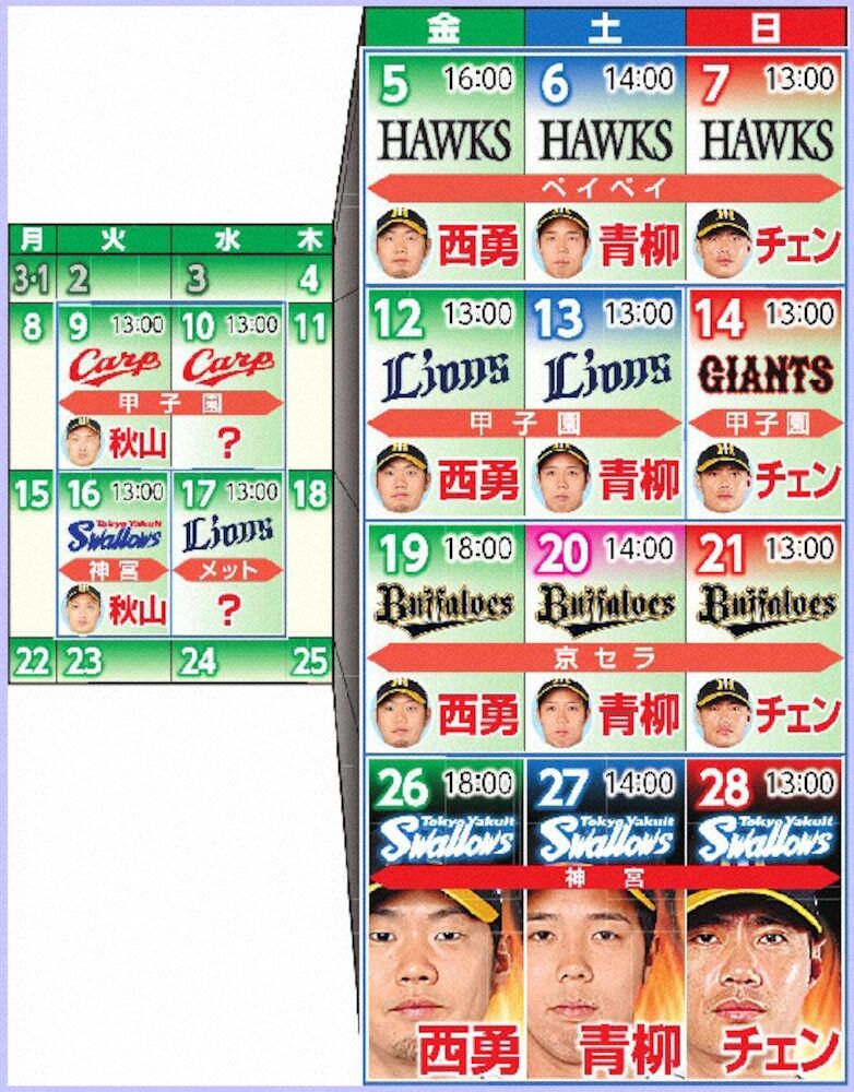 また、福岡遠征に同行しない秋山は、2月から火曜日の登板を継続しており、開幕2カード目初戦となる30日の広島戦に起用される可能性が高まった。3年ぶりの開幕1軍入りを狙う藤浪は、ソフトバンク3連戦中に中継ぎで複数イニングを投げる予定だ。