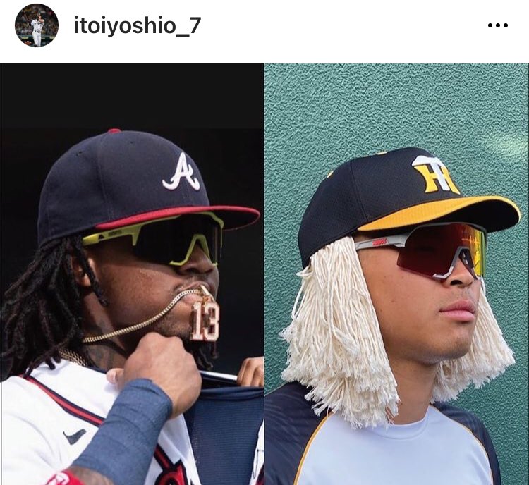ドレッドの髪型をモップで“完コピ”する熱の入れようだが、2枚目の写真に登場したのは近大の可愛い後輩・佐藤輝だった。先輩と同じくサングラスにドレッド姿でブレーブスのロナルド・アクーニャJr.外野手と対比する衝撃の1枚を公開している。