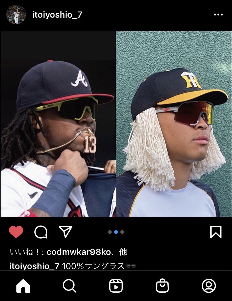 糸井がを自身のインスタで「100%サングラスかけやすさ! フィット感! デカサさ! めーーっちゃいい」とコメントを添え、パドレスのフェルナンド・タティスJr.内野手が使用するサングラスを試着する1枚をアップ。