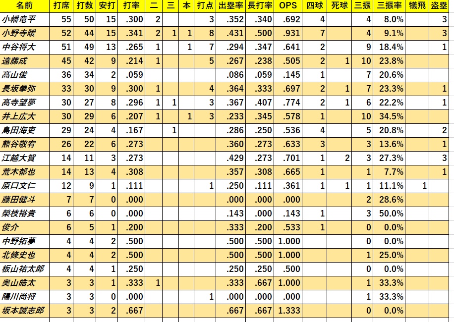 小野寺が高打率をキープしウエスタンリーグの首位打者に躍り出た。小野寺は出塁率、長打率でもリーグトップを記録している。また、小幡、高寺も3割前後のハイアベレージをキープ。井上はややブレーキがかかった。