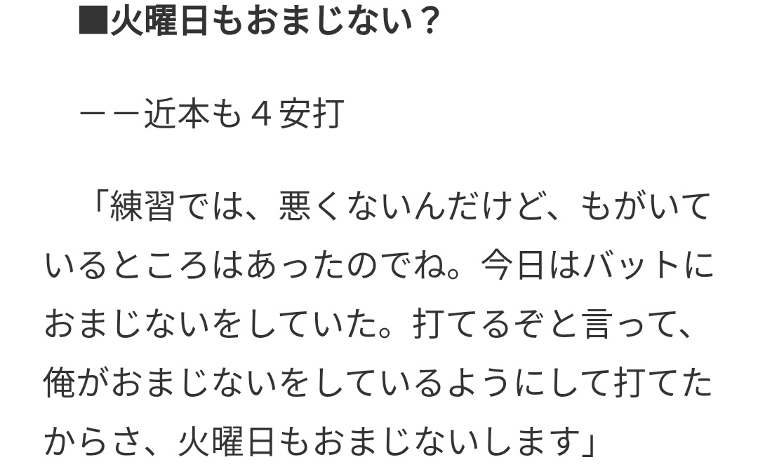 「練習では、悪くないんだけど、もがいているところはあったのでね。今日はバットにおまじないをしていた。打てるぞと言って、俺がおまじないをしているようにして打てたからさ、火曜日もおまじないします」