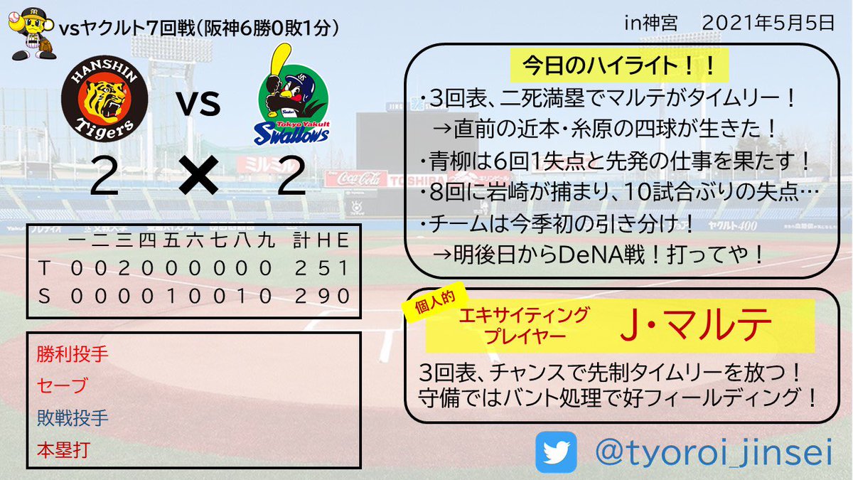 @hanshintigersjp 今日の重苦しさで引き分けは勝ちに等しい。守りも中野・マルテが素晴らしかった。
