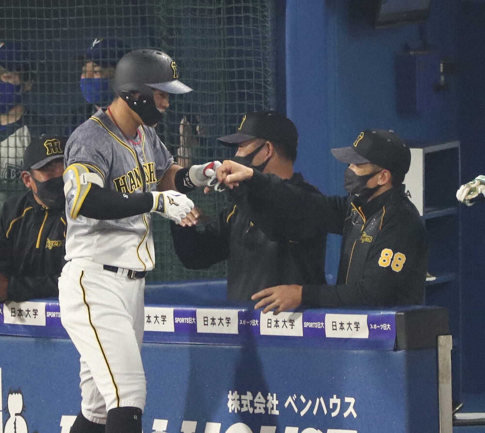 右翼最上段を襲った阪神・佐藤輝の特大10号ソロに、矢野監督は感心しきり。「あの当たりだし、いいホームランだった。このくらいのスピードで10本というのは大したもんやと思う」とドラフト制以降の新人では最速の33試合目での2ケタ本塁打到達を高く評価した。