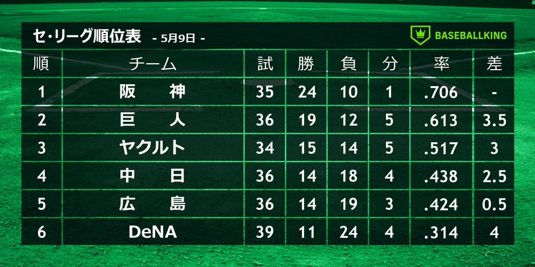 阪神が現在24勝10敗1分で首位を走り、19勝12敗5分の巨人が3.5ゲーム差の2位で、3位・ヤクルト、4位・中日、5位・広島、最下位・DeNAと続いていく。