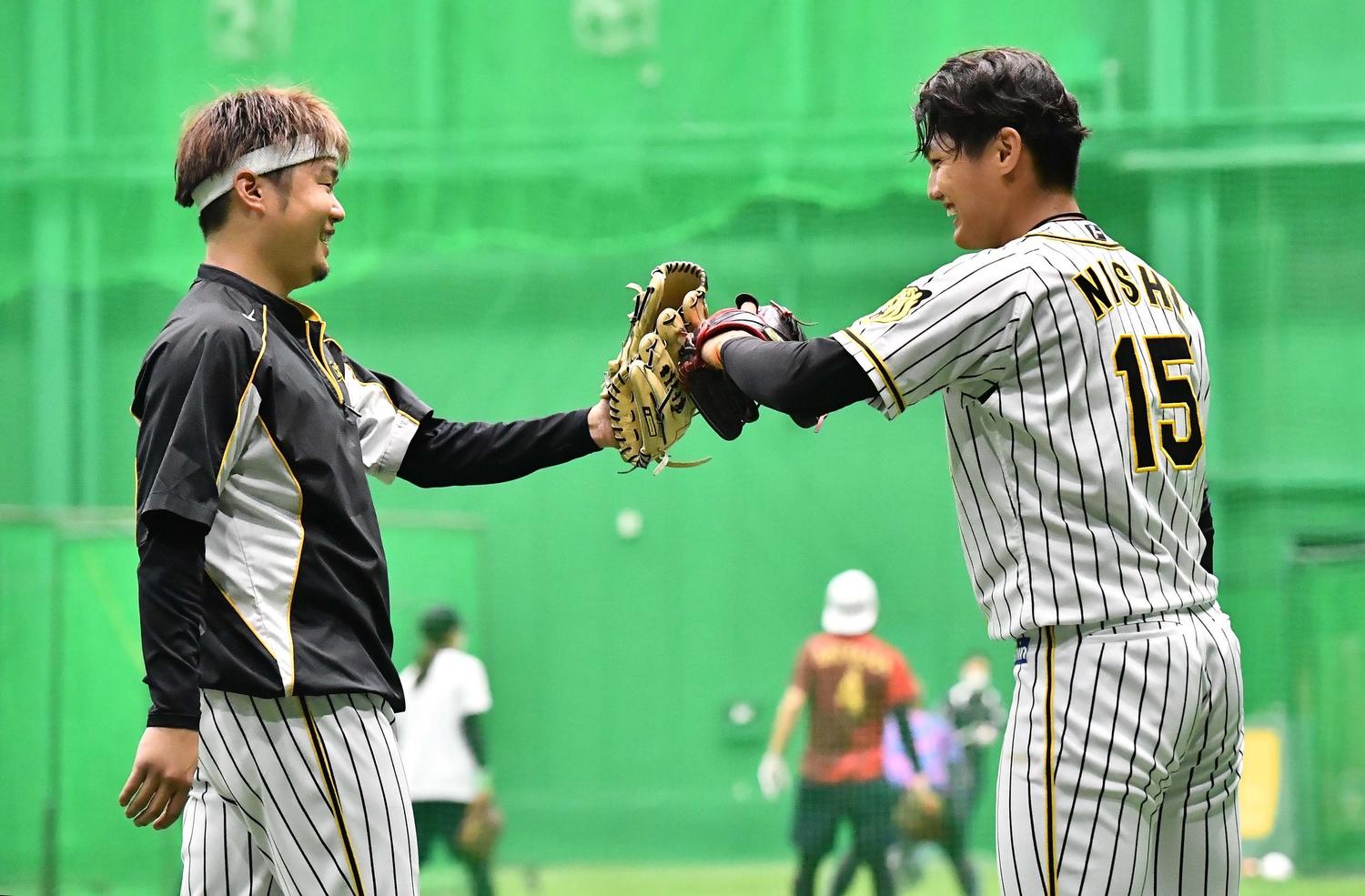 大黒柱の阪神西勇輝投手は18日のヤクルト戦先発で「兄貴分」の威厳を示したいところだ。翌19日に遠縁にあたる西純がプロ初先発の予定。この日は甲子園室内練習場で一緒にキャッチボールを行った。