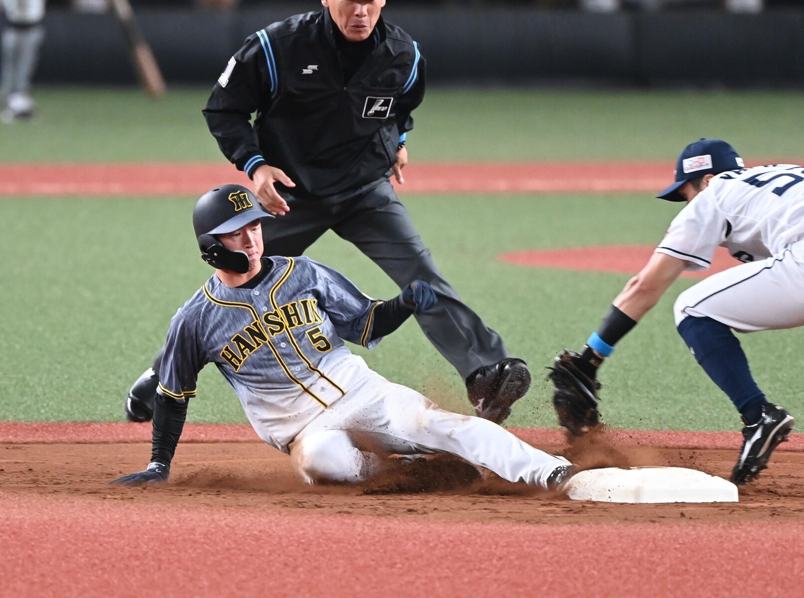 1点リードの三回だ。四球で出塁した近本が、中野の打席で二盗成功。カウント2-2から高橋が暴投し、二走・近本は三塁へ進塁。チャンスが拡大した中、中野も応えた。