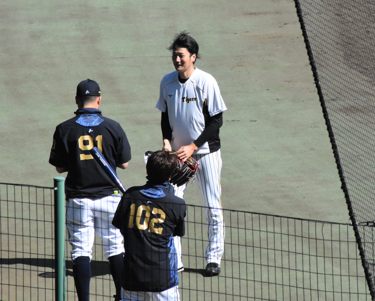 練習風景の一コマ。オリックスの能見投手が甲子園に戻ってきました。金村コーチと談笑していました。阪神の小林投手も古巣にあいさつしていました。