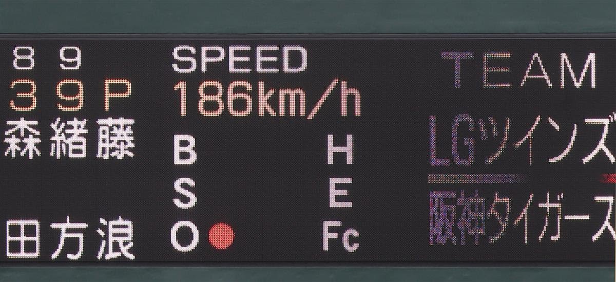 同点の8回裏、マウンドに上がったのは阪神藤浪晋太郎。先頭の近藤への4球目。直球をファウルではじき返された直後、表示された速度は、なんと「168」。度肝を抜く数字に、球場も大きなどよめきに包まれた。