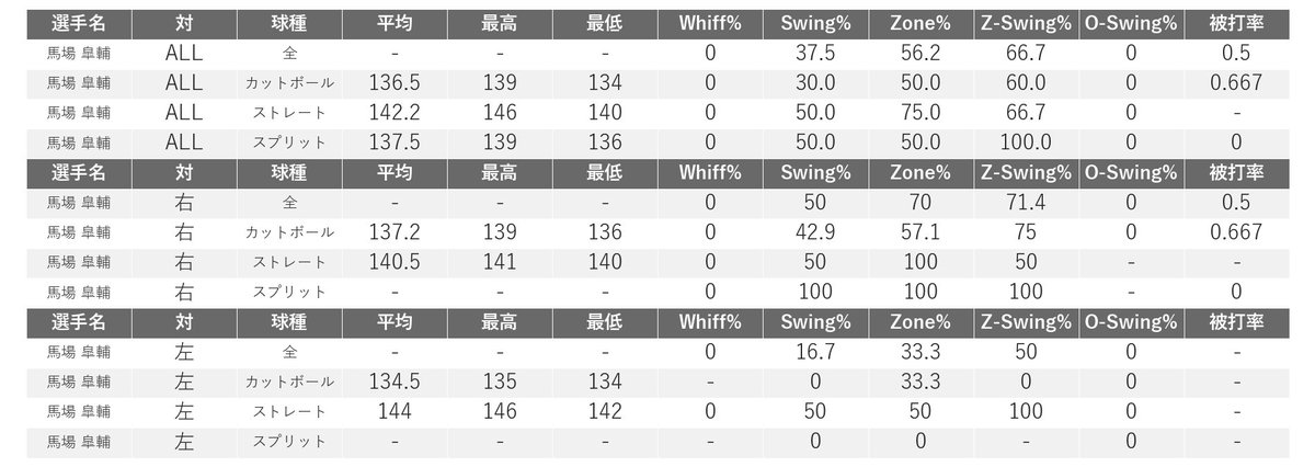 先発アルカンタラが打球を左足に受けて降板し、7回無死一塁でマウンドへ。高浜を遊ゴロ併殺に仕留めた後、四球と連続安打で1点差に詰め寄られるも、代打大田を初球スプリットで三ゴロ。矢野監督は「馬場も急遽の登板でちょっと最後はバタバタしたけど、何とか粘ってくれた」とねぎらった。