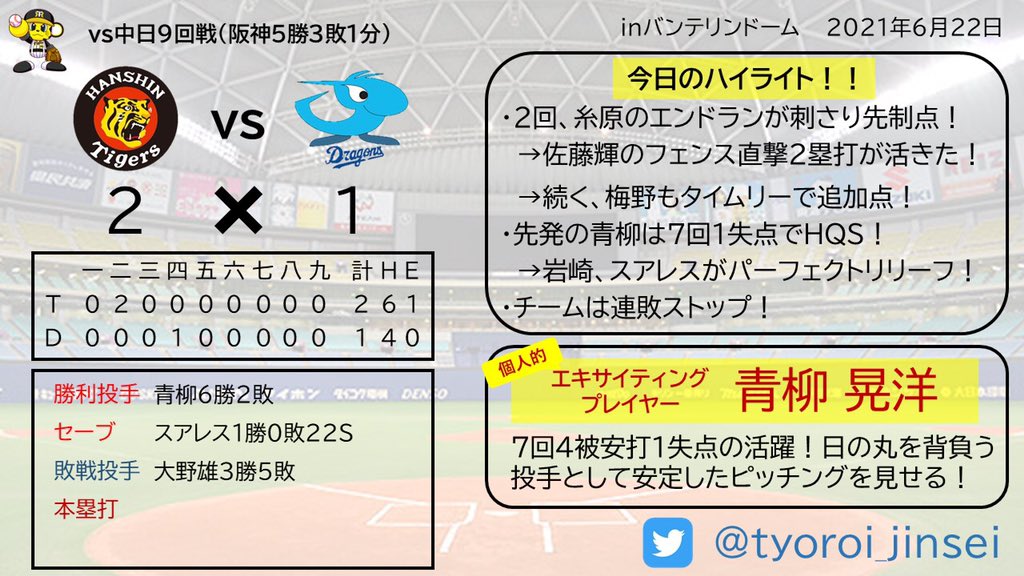 @hanshintigersjp 内容より結果よ!大野から勝ったのはクソでかい!青柳、岩崎、スアレスは安定やな