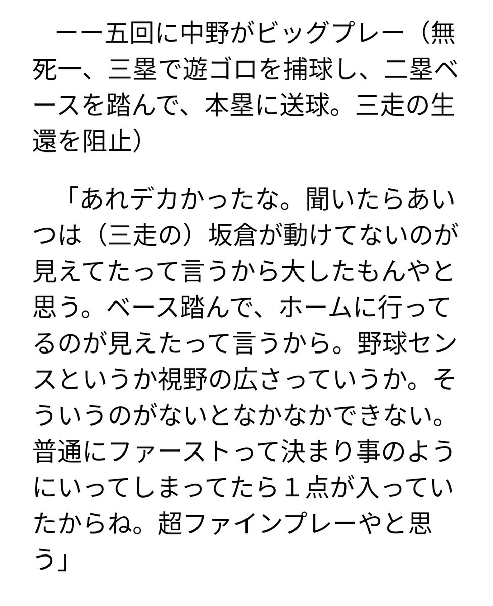 中野は二塁をアウトにした後本塁に投げた。坂倉もまさかと思ったでしょう。なぜあのプレーができるかというと試合に出続けて経験を積んでるから、あの判断ができるんですわ