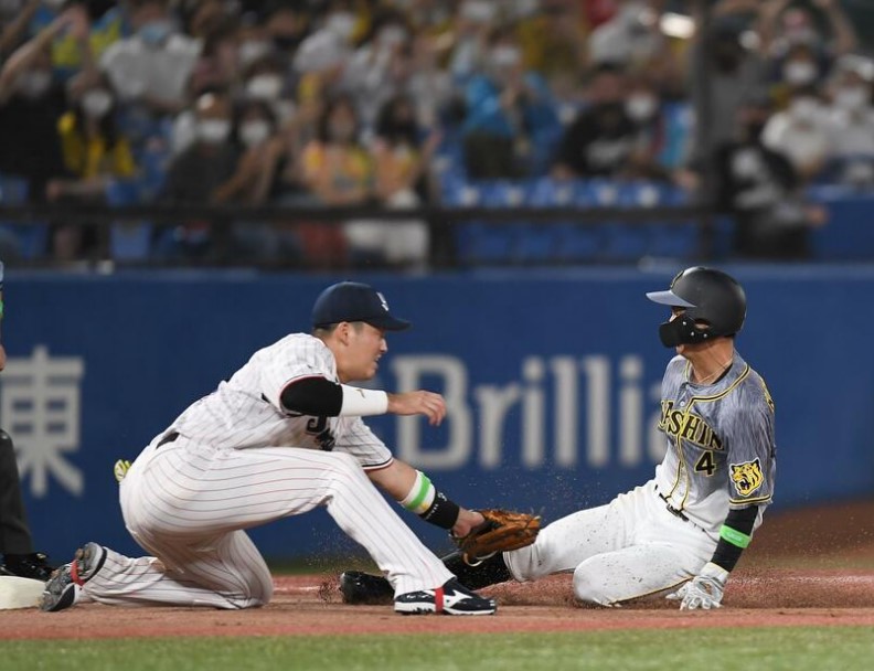 2点を追う九回無死一塁で近本が右前にヒットを放った場面。代走の熊谷は一塁から三塁を狙ったものの、右翼・渡辺が的確な返球をし、三塁手・村上もうまくタッチ。アウトになってしまった。この後、サンズの四球もあったが阪神は得点できず、敗れた。