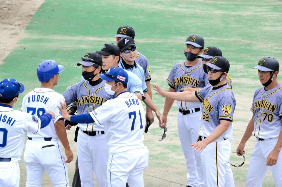 阪神の攻撃は七回2死満塁、井上の中飛で終了していたが、中日側から阪神の走者が何らかの伝達行為を行ったのではないかとのアピールがあったと見られる。中日・仁村2軍監督が「やってるやんか、こうやって」とベルト付近を触り、両足を踏むような仕草を見せ、平田2軍監督は「やってるわけないやんか」と抗議。両チームの首脳陣の激しい言い合いとなった。