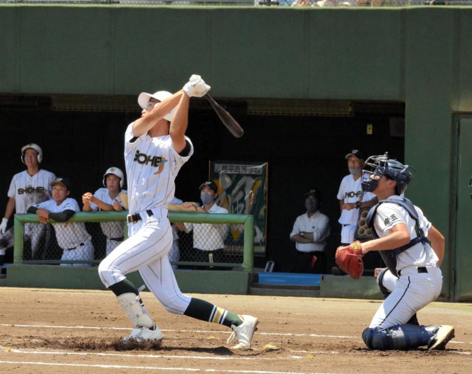 昌平の3番・吉野創士(3年)が8回2死の最後の打席で、左中間三塁打。/