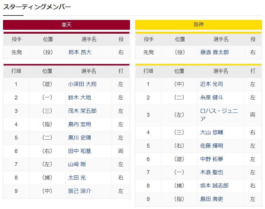 【エキシビジョンマッチ】楽天ー阪神 スタメン 2021/8/10 2021年08月10日 カテゴリ:阪神タイガース mixiチェック ネット配信 DAZN、パーソル パ・リーグTV、Rakuten TV、ベースボールLIVE 阪神タイガース @TigersDreamlink 2021-08-10 17:24 【8月10日 E-T エキシビションマッチ】 本日のスタメン発表!先発投手は藤浪投手です! https://hanshintigers.jp/game/score/ #阪神タイガース #挑超頂 たくちゃんたくちゃん @0KVL3uNLguLLd7J 2021-08-10 17:26 @TigersDreamlink ロハスに6番中野?ファーストキナミ? しずえだよ。 @sizusizue 2021-08-10 17:24 @TigersDreamlink ロハス😳😳😳😳 悪魔。👿😈 @a_kuma_ 2021-08-10 17:25 @TigersDreamlink 大山くん😍 タイガーロック 遊び人ギルド @yusuke11011852 2021-08-10 17:29 @TigersDreamlink ロハス後半戦スタメンかな? 藤浪頑張って! 犬井巧 @CCS0306Baseball 2021-08-10 17:27 お、今日はロハスがスタメンか。果たしてどうなるかな…。てか、木浪選手ファースト?? ねこすけ @nekonekko_777 2021-08-10 17:21 ロハススタメン!!!! Joe バイデン @MakeUSA_Great_A 2021-08-10 12:49 ロハスはサンズかマルテのスタメンを奪ってほしいよ ガリア @galliaa_ 2021-08-10 17:14 ロハススタメンじゃん 盆と正月 @Chinpan_GSR 2021-08-10 17:28 エキシビションだからロハスでお遊びできるのいいな これで本来の姿見せてくれたらええんやねど 矢野さん @DomesamaTigers 2021-08-10 17:28 @hanshintigersjp エキシビジョンのロハスは怖いぞ 知らんけど ヒビキ @HibikiKamiyan 2021-08-10 17:28 ロハスレフト タグ :#エキシビジョンマッチ#楽天ー阪神#スタメン#8月10日 「阪神タイガース」カテゴリの最新記事 コメントする コメントフォーム 名前 コメント 記事の評価 リセット リセット 顔 星 情報を記憶 コメントを投稿する