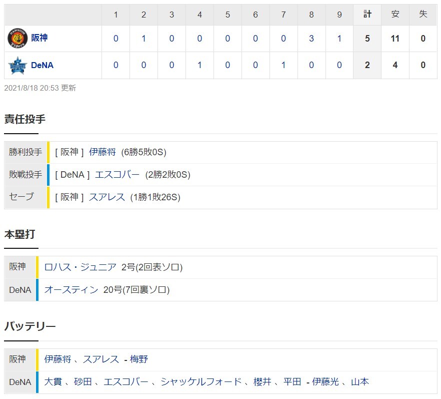 【一軍】阪神5-2DeNA