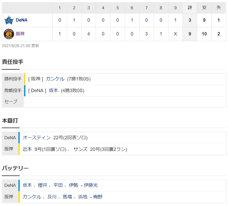 【一軍】阪神9-3DeNA