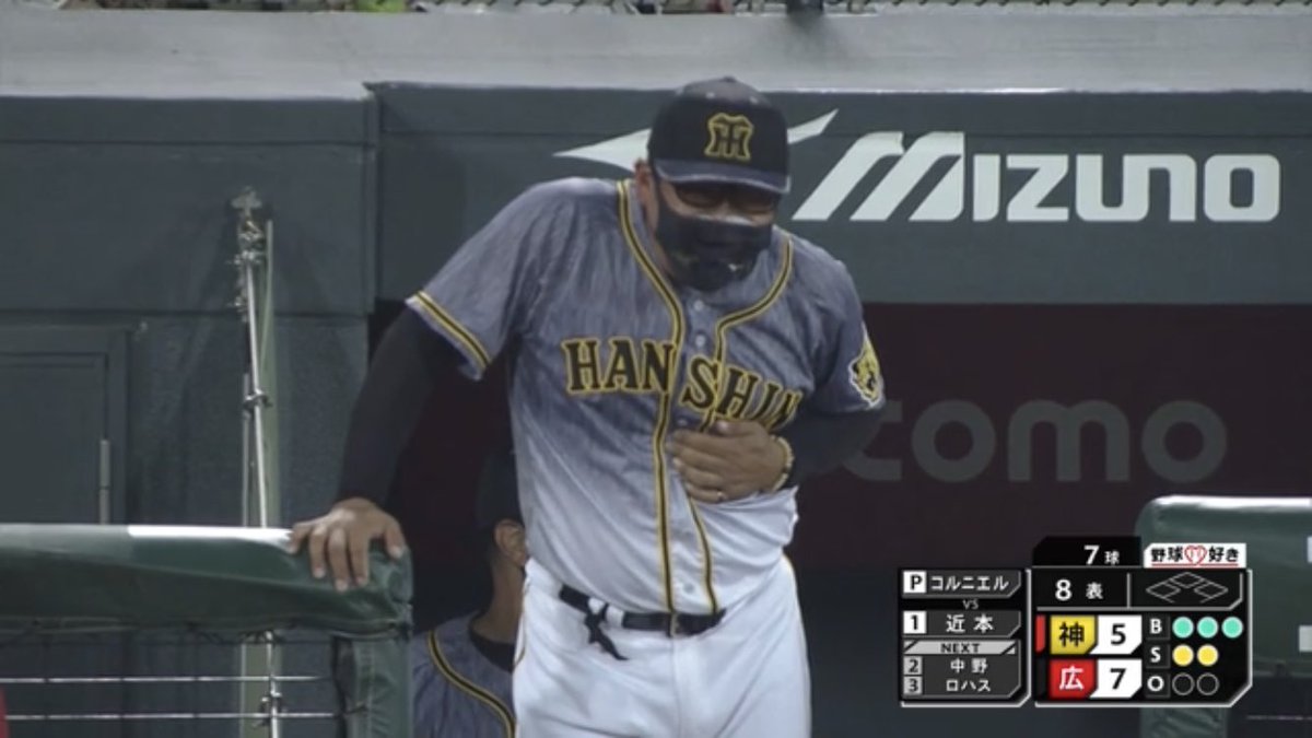 2点を追う8回、コルニエルの直球を打った近本の打球は三塁側ベンチにいた北川コーチの腹部を直撃。痛みにこらえながらおなかをさすり、最後は両手で大きく丸ポーズを作り、問題がないことを笑顔でアピール。近本は心配そうに見つめるも、まさかの事態にベンチにいたメンバーは笑いをこらえられない様子だった。