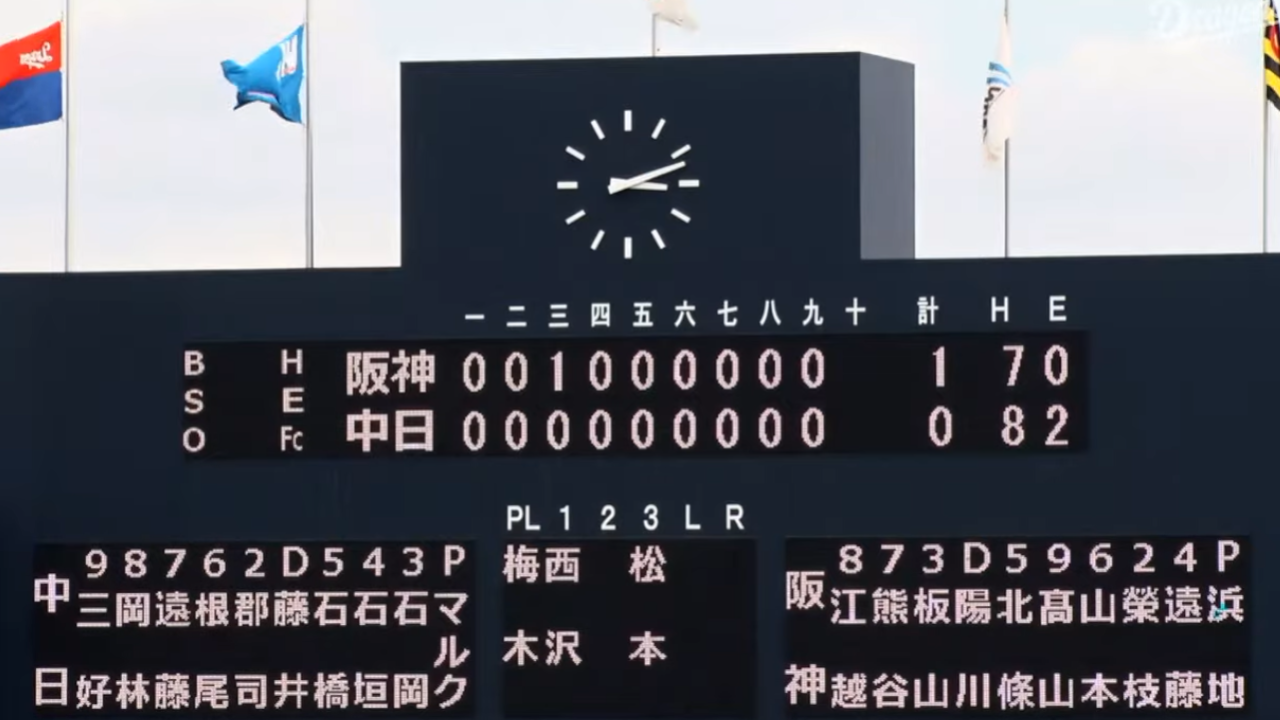 3回に板山が、中日先発・山本から適時打を放って先制。その後は両者一歩も譲らない投手戦に。8回には2死一、三塁のピンチを招いたが二保が粘投。4人の投手陣で虎の子の1点を守り切った。なお、この試合は、8月3日に亡くなった中日・木下雄介投手の追悼試合として行われた。