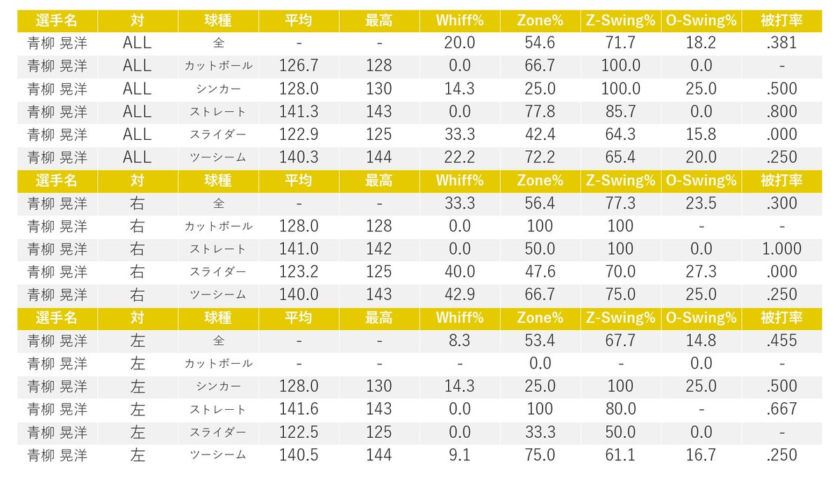 青柳さんが誤算すぎた。前回登板に続き5失点はさすがにしんどい。打線は2安打3出塁。そりゃ勝てんて。阪神の課題は点差がついたときのリリーフ、貧打、凡フライ、三振、エラー、与四球。阪神はリズムの波に乗らないと打てない。だからこそ投手陣がリズムを作らなけばいけない。