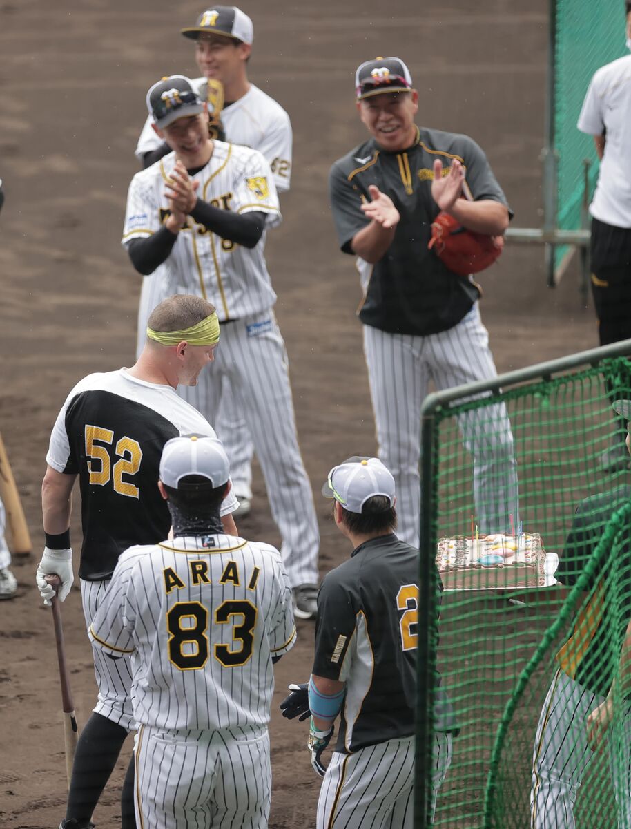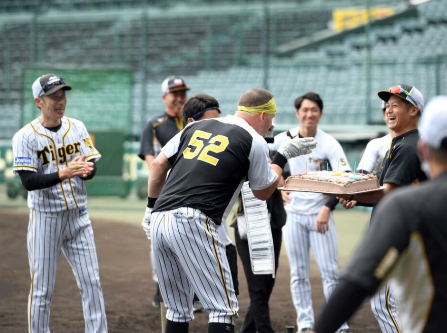 34歳の誕生日を迎えた阪神のジェリー・サンズ外野手にサプライズ。甲子園での試合前練習で坂本からバースデーケーキが贈られた。