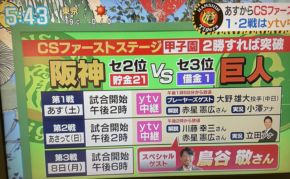 CSファーストステージ2日目、読売テレビのスペシャルゲストに鳥谷やん💕