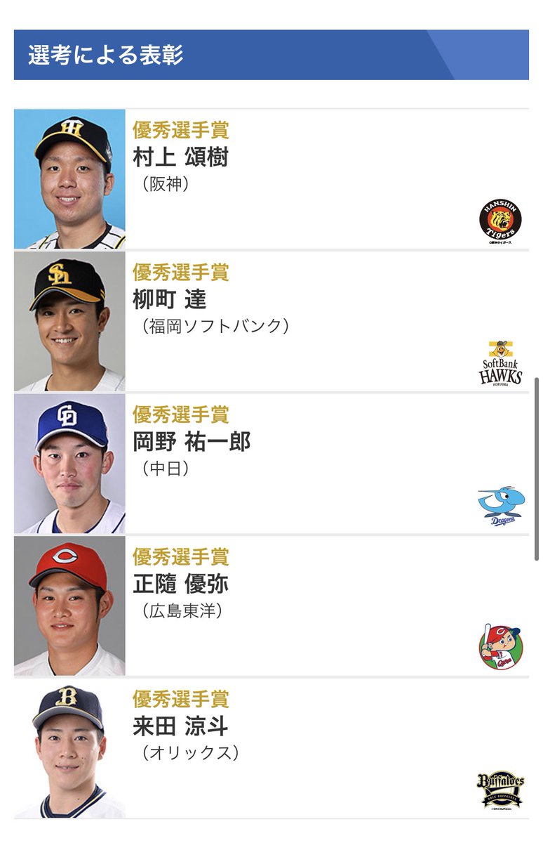 ファーム優秀選手賞はウエスタン・リーグでは村上の他に柳町(ソフトバンク)、岡野(中日)、正随(広島)、来田(オリックス)が選出された。受賞者は15日に開かれる「NPB AWARDS 2021 supported by リポビタンD」で表彰が行われる。