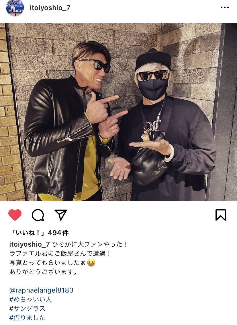 「ひそかに大ファンやった! ラファエル君にご飯屋さんで遭遇! 写真とってもらいましたぁ」と書き込み、サングラス姿のツーショット写真を投稿。ハッシュタグには「#めちゃいい人」「#サングラス」「#借りました」と添えた。