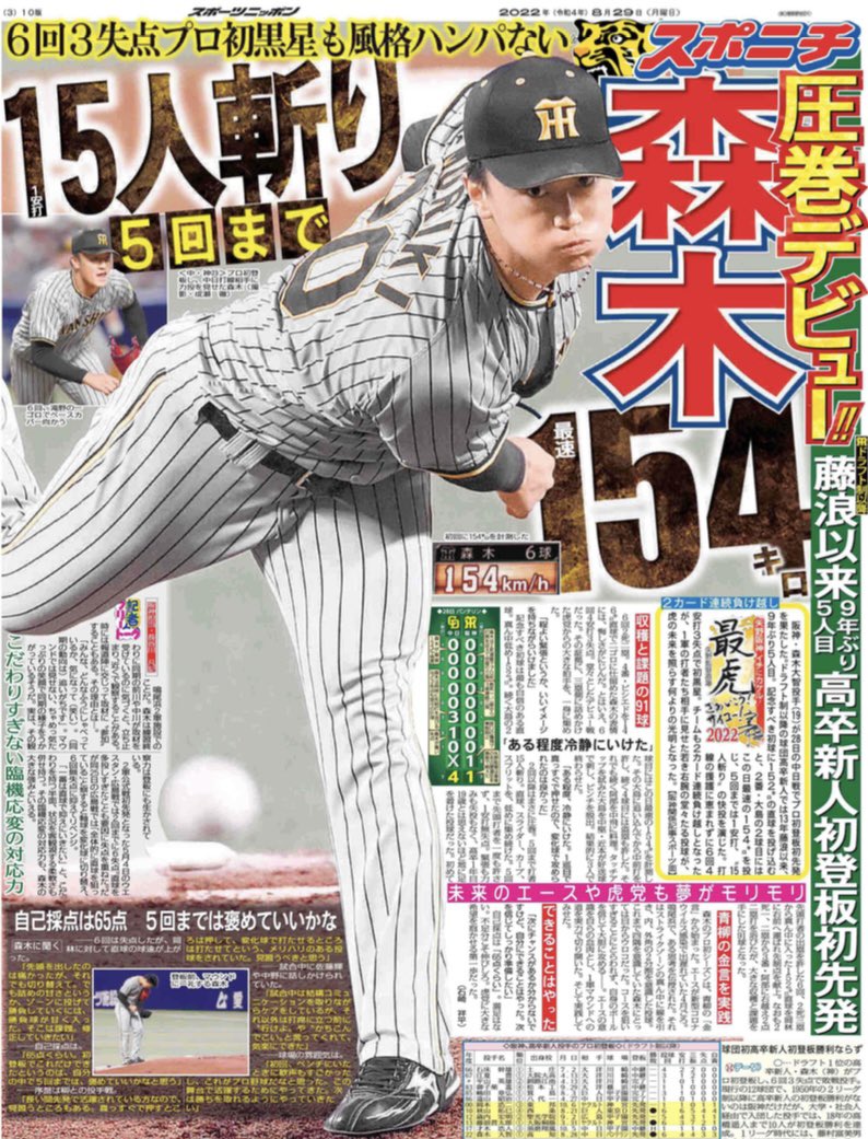 【金本知憲 視点】じっくり森木の投球を見るのは初めてだったが、一言で言えば、非常に楽しみな投手だ。近い将来、エースになれる逸材。すでにプロとしての体も、できつつあると感じた。この日の投球だけで判断すれば「弱点」もあまり見られなかった。
