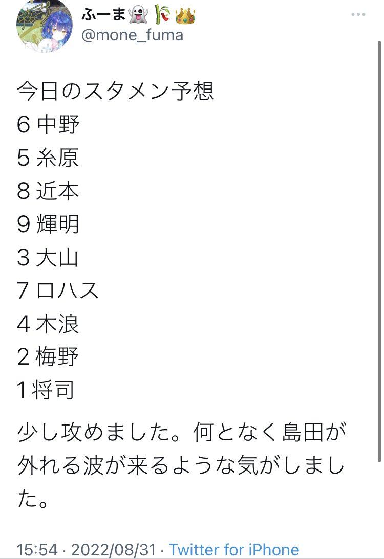 阪神ー広島 スタメン 甲子園球場 2022/8/31 2022年08月31日 カテゴリ:スタメン(2022) mixiチェック テレビ放送 広島ホームテレビ1、ABCテレビ1、NHKBS1、スカイAネット配信 DAZN、虎テレ 阪神タイガース @TigersDreamlink 2022-08-31 17:29 【8月31日 T-C 公式戦】 本日のスタメン発表 先発投手は伊藤将投手です! https://hanshintigers.jp/game/score/ #阪神タイガース #イチにカケル! んにゃぴ @Za50ppwU4TR3lJg 2022-08-31 17:31 @TigersDreamlink ここで2番糸原きたああああああああああああああ ふーま👻🎋👑 @mone_fuma 2022-08-31 17:29 @TigersDreamlink 井上一樹の裏垢かもしれない… pic.twitter.com/eWj6kSkI5K やんだー @yyyyayyyayyya 2022-08-31 17:30 @TigersDreamlink ロハス様が勝利に導かれます Astro @AoxeAstro248 2022-08-31 17:31 @TigersDreamlink 糸原は九里に6-3らしい 野球垢 @oJSdrrMDjz2GnCl 2022-08-31 17:31 @TigersDreamlink だからさ近本1番に戻せて。中野1番もうそんな機能してないやん 田中・デエナモ @tora_aniota 2022-08-31 17:30 ロハスと大して走力変わらん糸原が2番に入ってしまったか... とし@阪神応援🐯 @Tigers_Tossy 2022-08-31 17:30 やっぱ島田スタメン落ちだけど、2番にそのまま糸原かw ブレないねえw https://twitter.com/sponichihinata/status/1564889783633346561 … ムクタ虎党@ウェディのミストルティナー @kurusixe 2022-08-31 17:30 隙あらば糸原 魔太郎 @motoMatarou 2022-08-31 17:30 木浪と糸原同時に出すんか なんと迫力のない打線なんだ とらぶる @tigertrouble1 2022-08-31 17:30 2番サード糸原をやってまで左3人固めたい? 雷斗 @kaminaribolt 2022-08-31 17:29 昨日島田に代打糸原とそのあとサードの守備につかせたのを批判されたから矢野井上一樹は絶対に意地になっている気がする(沈) ひと @prsp_hanshin 2022-08-31 17:29 すげえ2番糸原してきやがった首脳陣 しゅんすけ @hanshinnnnnnn03 2022-08-31 17:29 今更やけど 足を使った野球を強みにしてる中 糸原を頑なに使うの矛盾してない?w あすいと @asuito_33_th 2022-08-31 17:31 木浪今日もスタメンなんか... くぼた学 @We_hate_TIGERS 2022-08-31 17:31 一体なぜ木浪>山本? タグ :#阪神ー広島#スタメン#甲子園球場#阪神タイガース#野球 「スタメン・試合結果」カテゴリの最新記事 コメントする コメントフォーム 名前 コメント 記事の評価 リセット リセット 顔 星 情報を記憶 コメントを投稿する