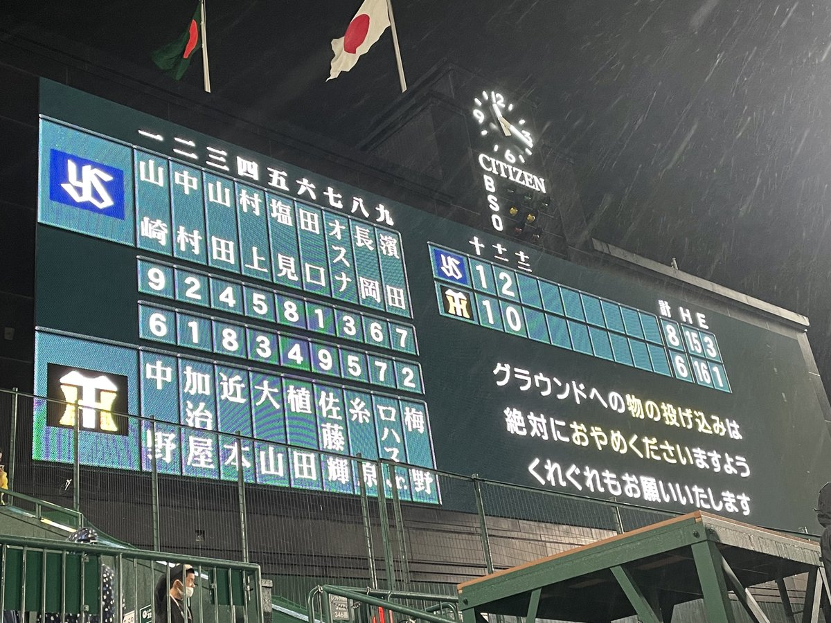 霧雨が降り注ぐ甲子園に、悲鳴とため息が充満した。6-6の延長11回。6番手浜地が単打と2四球で無死満塁のピンチを背負い、打席には村上。高めの直球で空振り三振を奪い、流れを引き戻したかに思われた。だが、塩見に内角低め直球を捉えられ、打球は前進守備を敷いていた遊撃中野の上を通過しセンター前へ。2人の走者が生還し、今季最長5時間17分の延長大激闘の末に力尽きた。