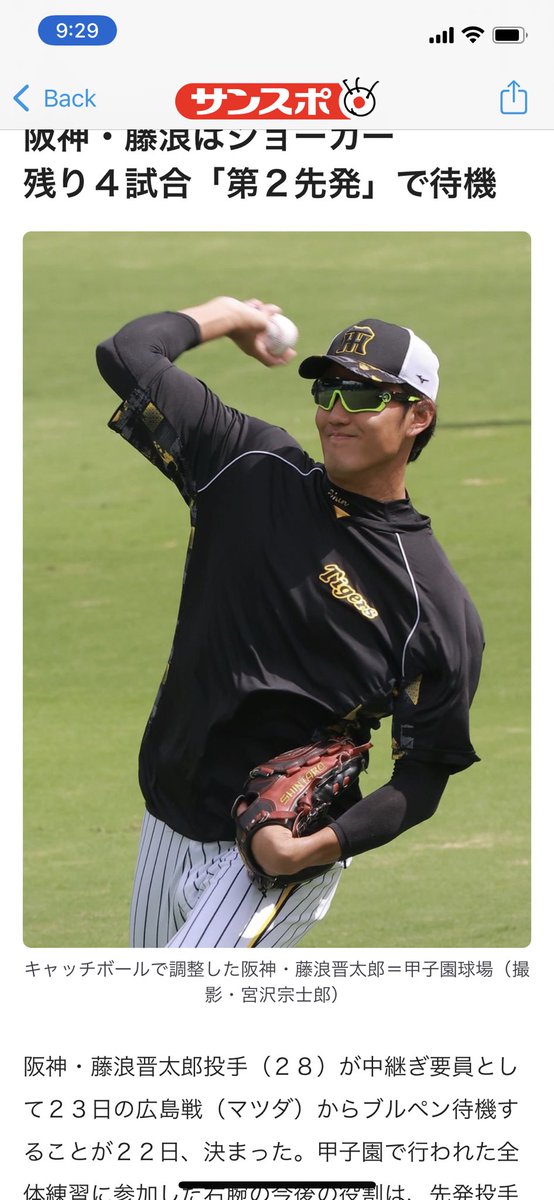 阪神・藤浪〝第2先発〟待機 負けられない一戦へ中4日でブルペン入りの見込み/阪神タイガース/デイリースポーツ online https://www.daily.co.jp/tigers/2022/09/23/0015662579.shtml … # @Daily_Onlineより