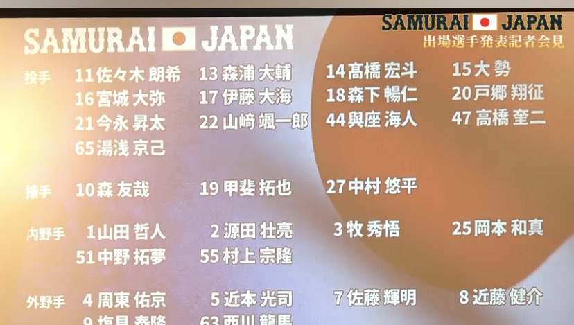 侍ジャパン 村上、佐々木朗ら28人を発表 15人初選出 阪神は佐藤輝ら4人が初代表/野球/デイリースポーツ online https://www.daily.co.jp/baseball/2022/10/04/0015694955.shtml …