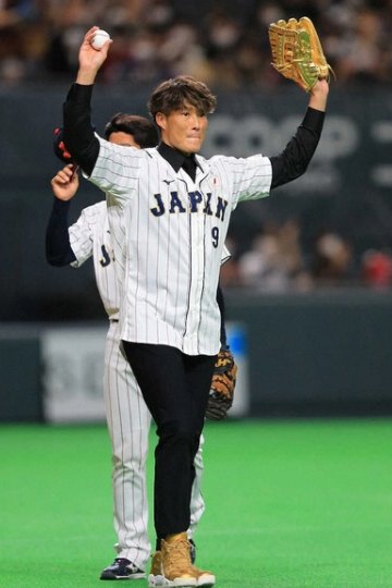 【侍ジャパン】金ピカの糸井嘉男が始球式 BIGBOSS指令で特注グラブも一塁側スタンドへ(スポーツ報知)