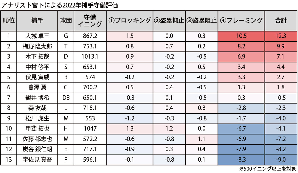 捕手の梅野隆太郎はゴールデン・グラブ賞では中村悠平(ヤクルト)に231票対22票で完敗したものの、『SIS』は2位がDRS12だったことに言及しながら、「ウメノはDRS23をマークし、守備に関して最も支配的なシーズンを送った」と評価した。