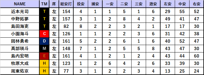※投安(2塁打・3塁打・本塁打含む以下同様)・捕安・一安・二安・三安・遊安・左安・中安・右安を全て記録した選手